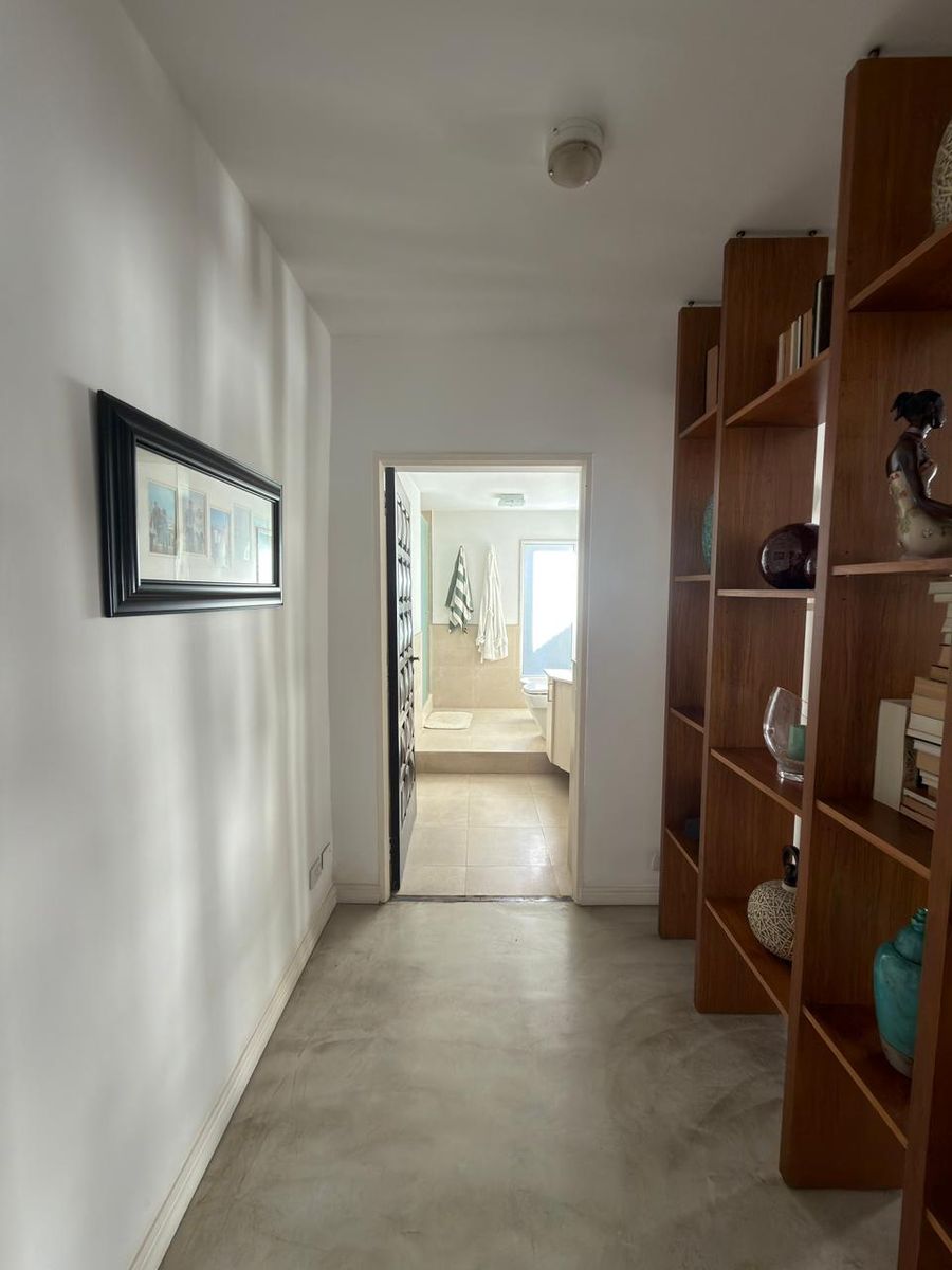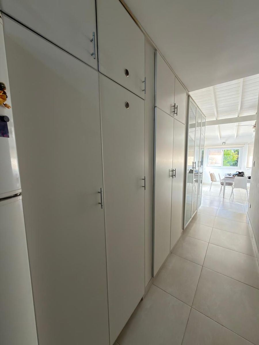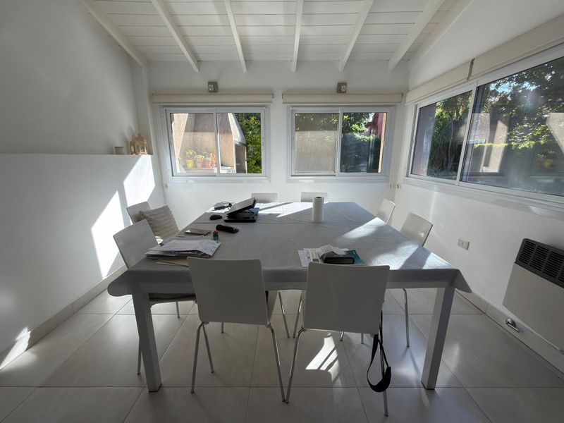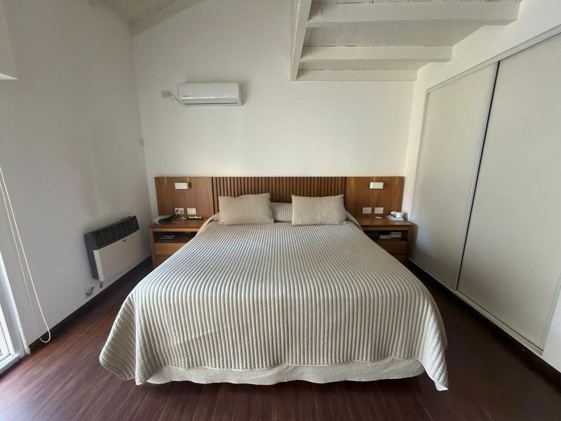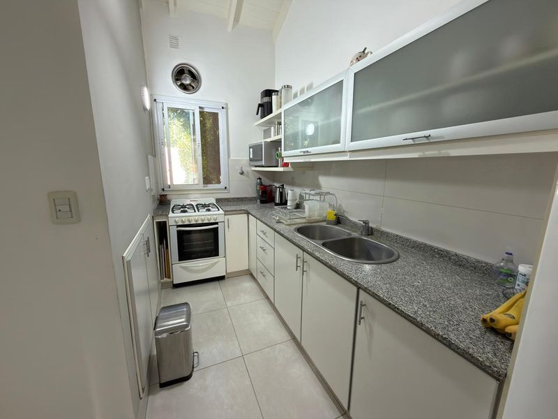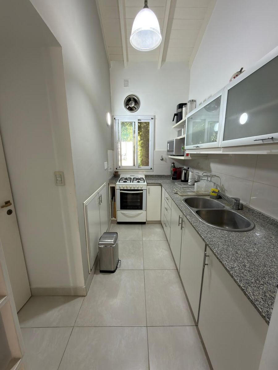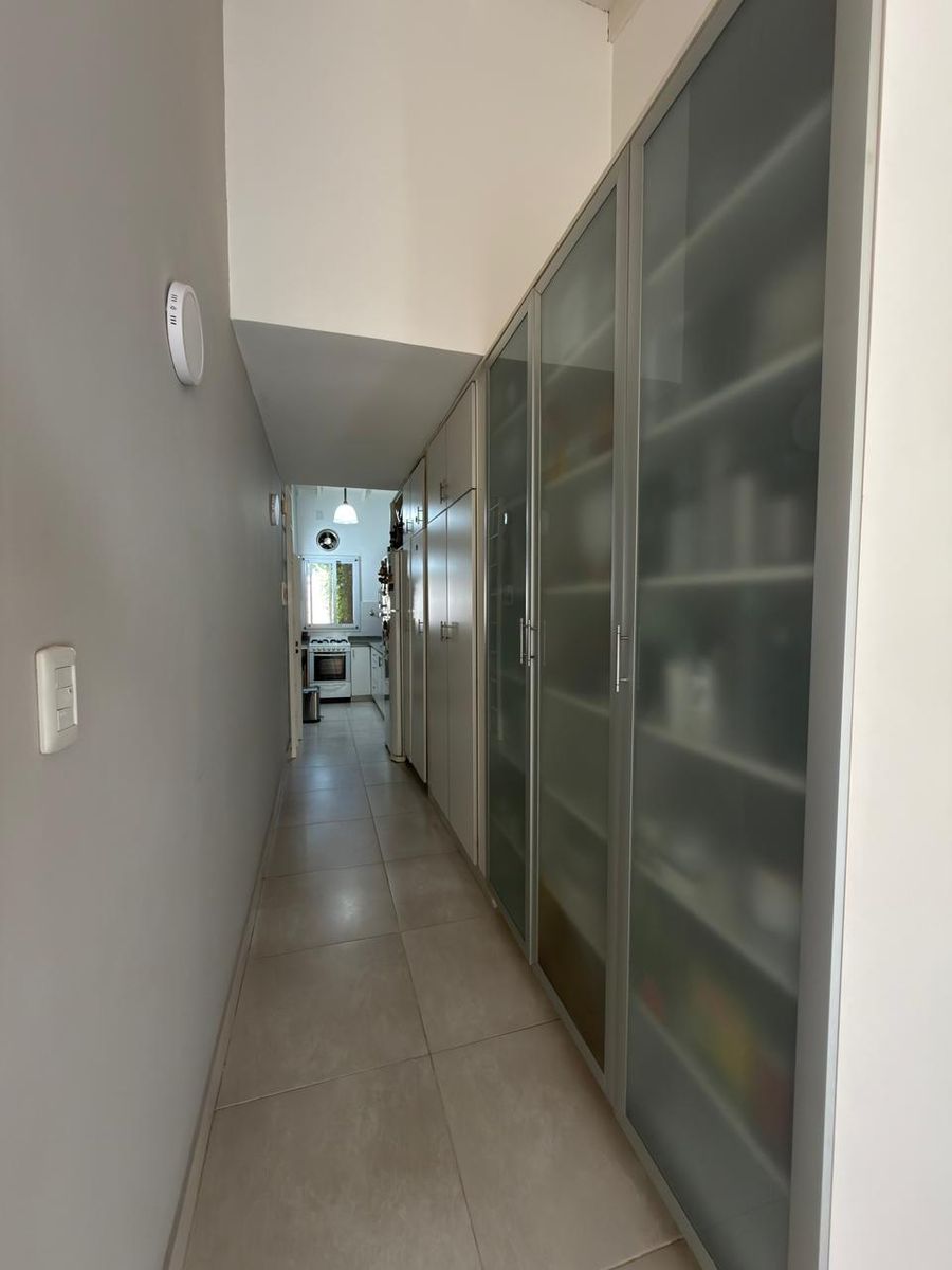 En planta baja cuenta con hall de entrada, amplio living con hogar y escalera caracol, baño completo, luminoso comedor con vista al jardín, un dormitorio en suite con placard y baño propio. La cocina, cuenta con bajo mesada y alacenas, además de incorporar un práctico espacio de guardado tipo despensa integrado al pasillo.