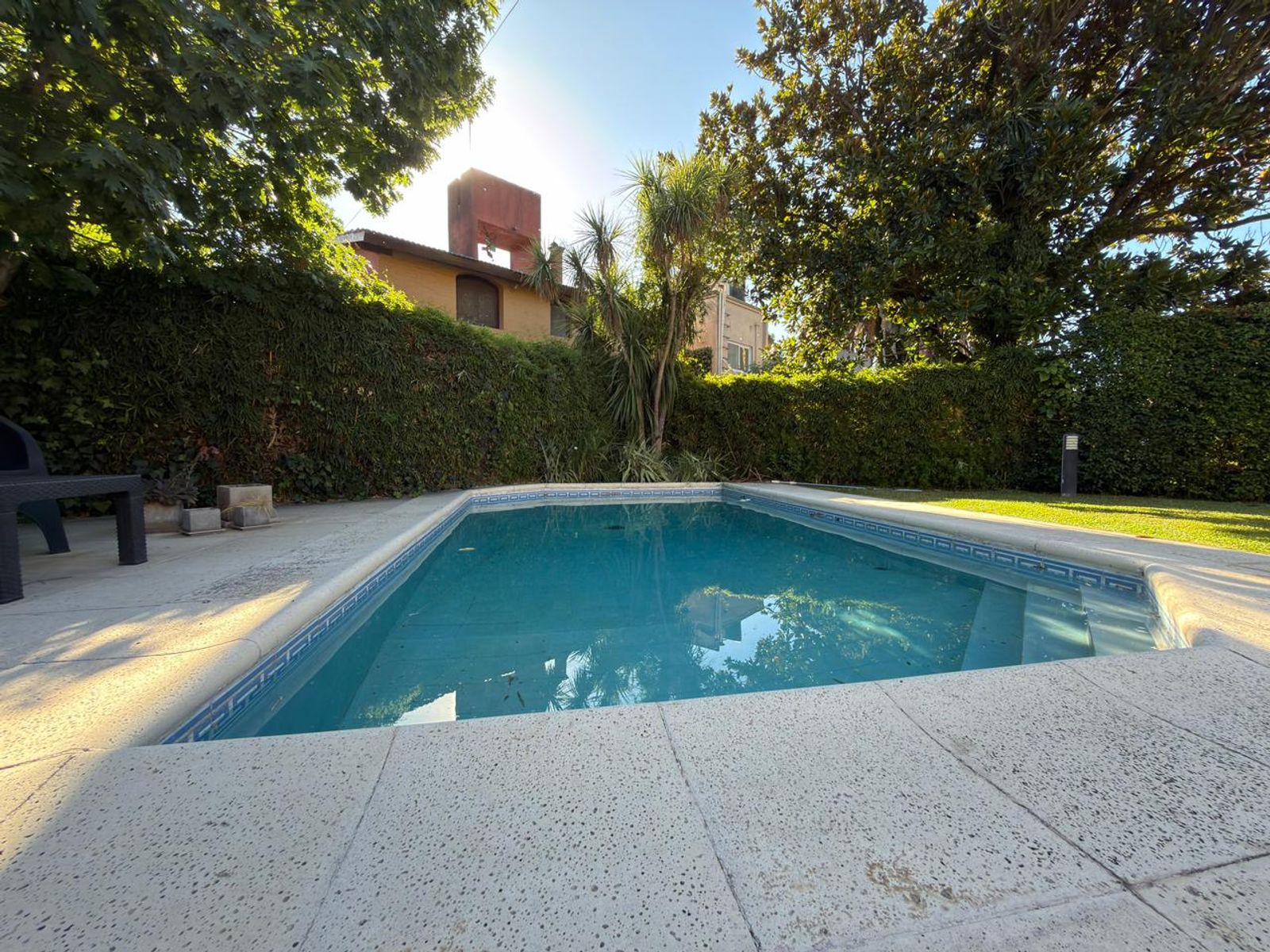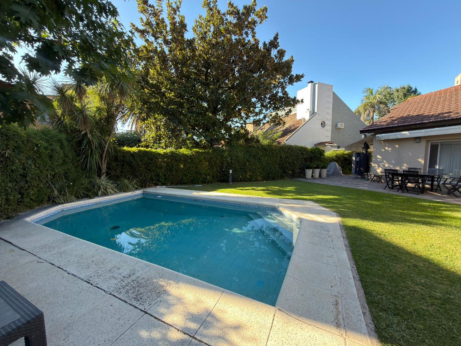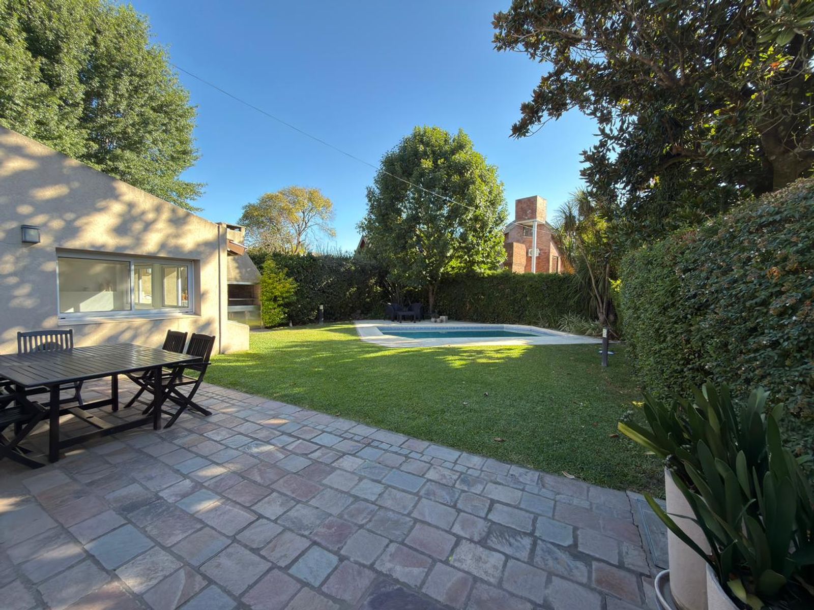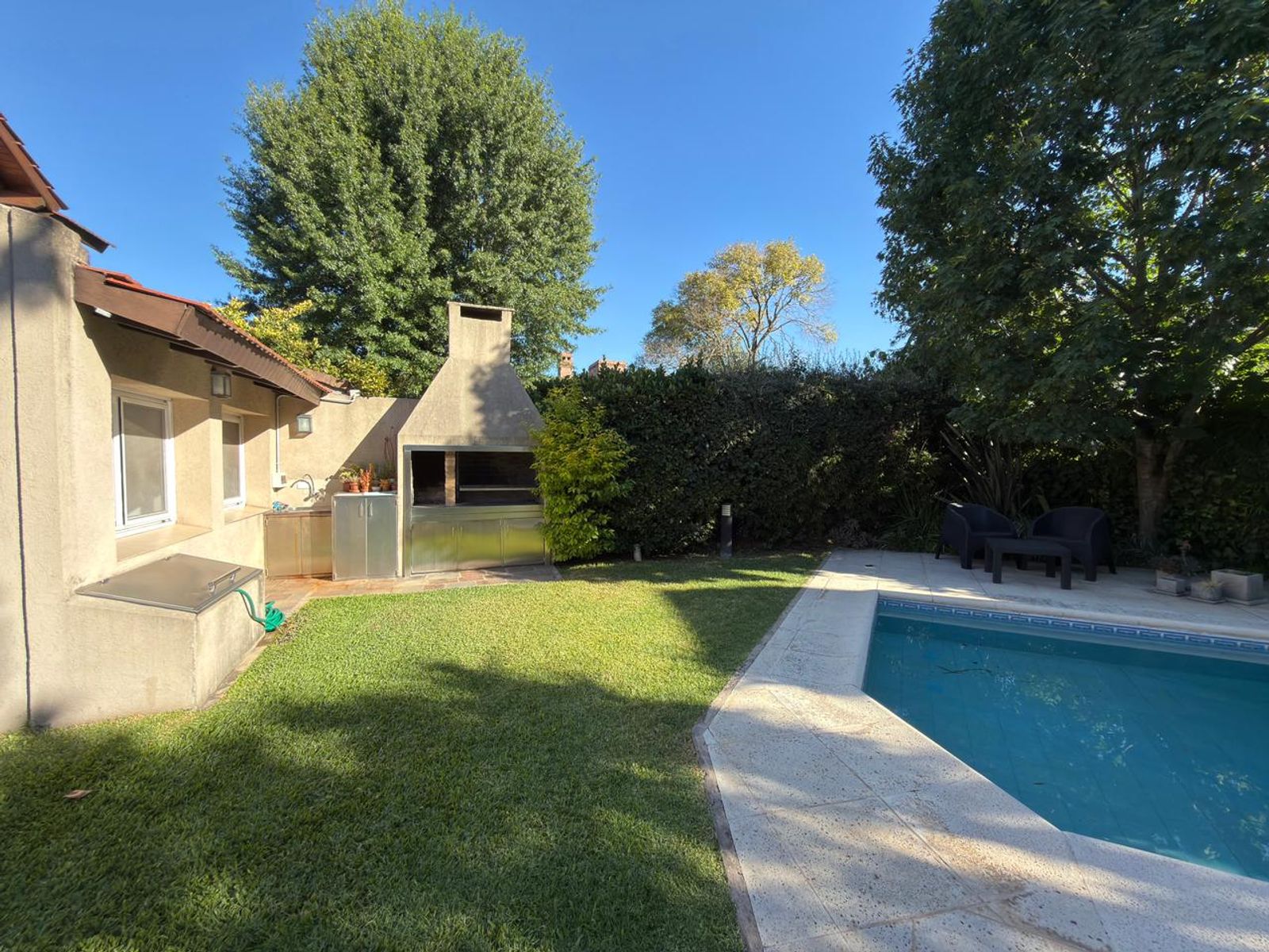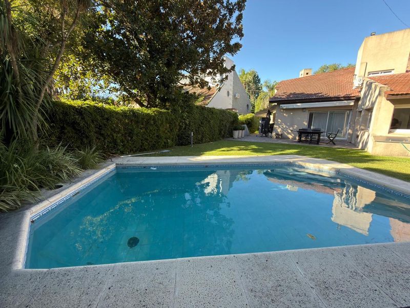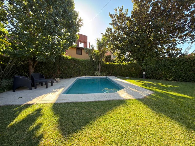 En el exterior se destaca un gran jardín trasero con pileta y parrilla.